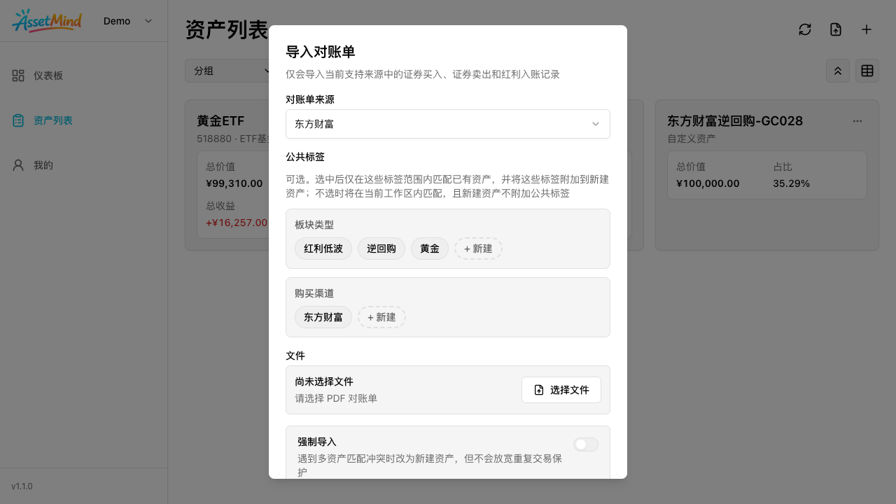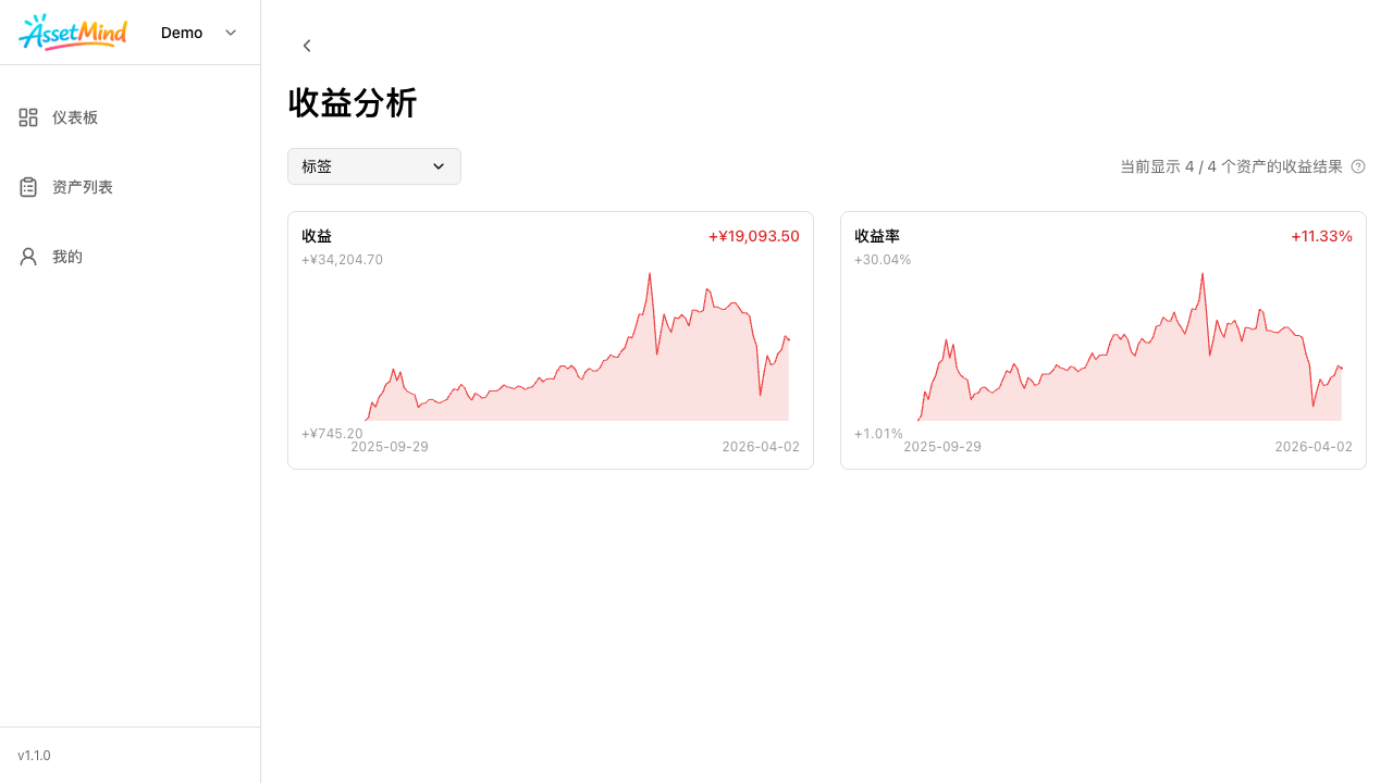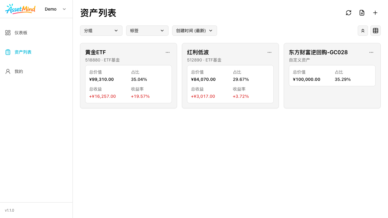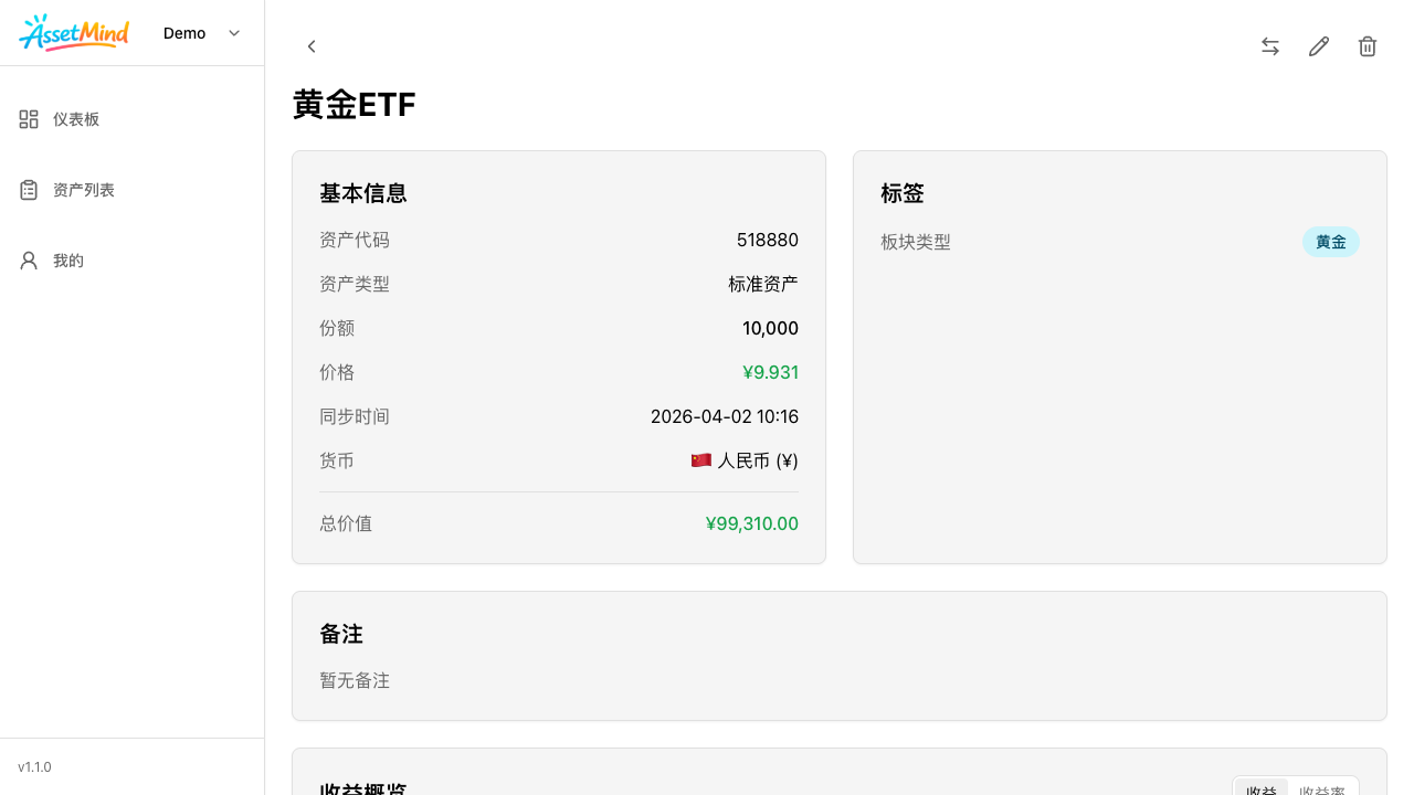 无论是基金、贵金属、银行账户,还是信用卡,AssetMind 将分散在各处的资产汇聚到同一个仪表板,随时掌握总资产价值与分布。
