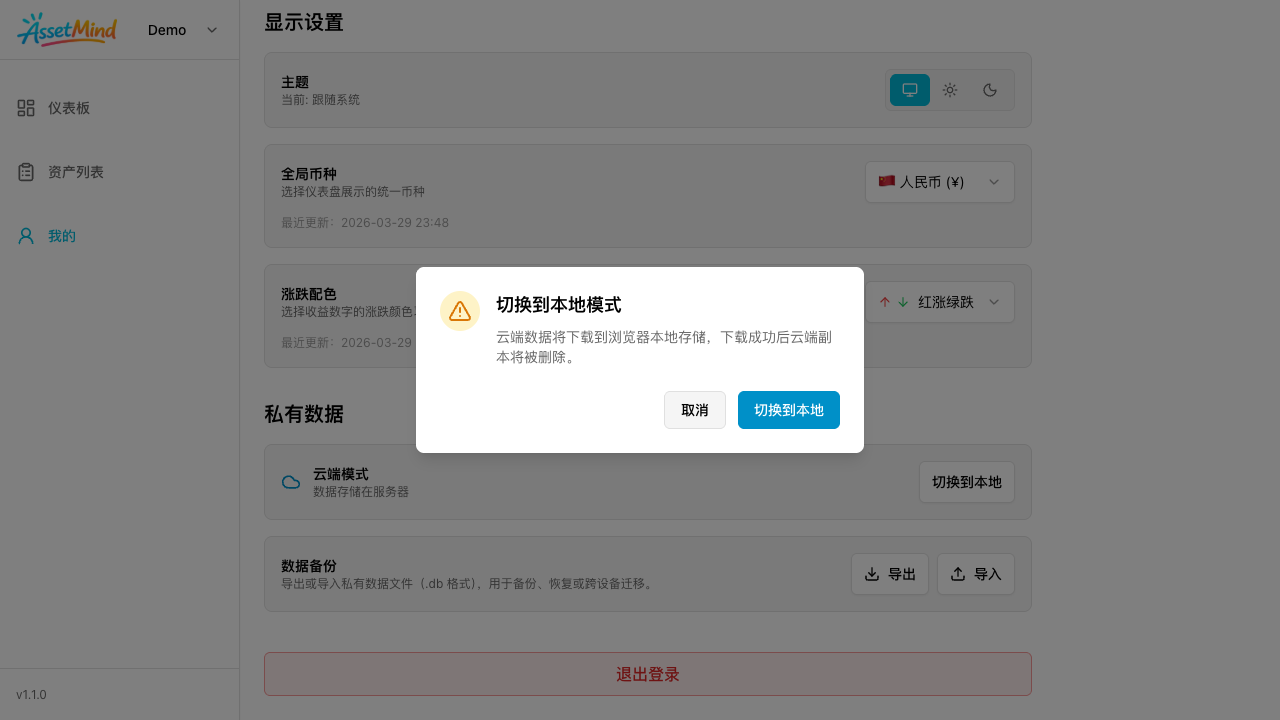 AssetMind 支持将投资数据存储在本地,无需上传至服务器。财务隐私完全由你掌控,安心使用。